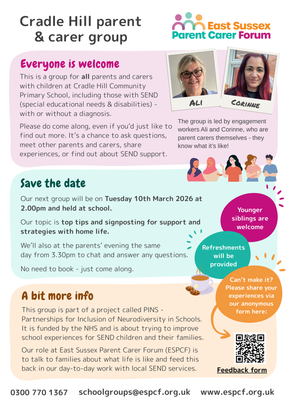 We are pleased to be welcoming back the Parent Carer Forum for a coffee afternoon. Welcome to all questions and queries on the SEND spectrum, please do drop in and see them.