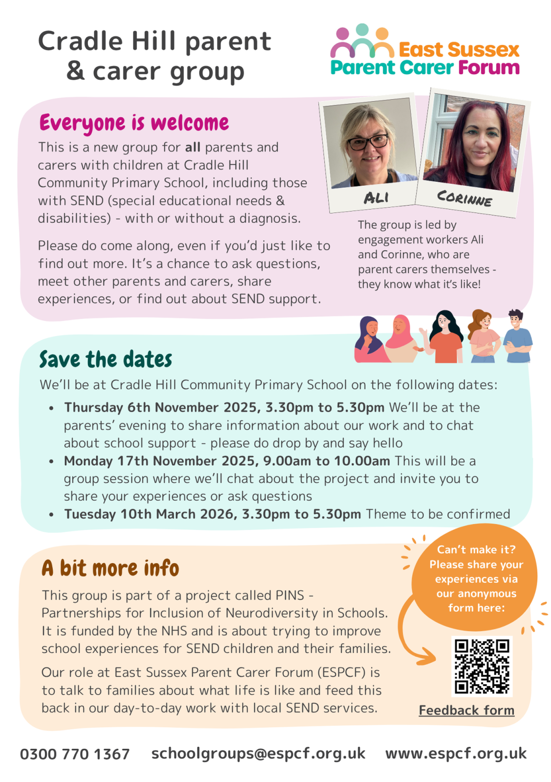 We are pleased to be joined by representatives from the East Sussex Parent Carer Forum to our Parents Consultation on 6th November.